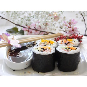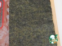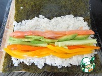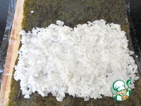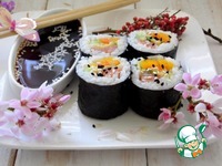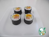 Описание: Роллы они же суши-рулеты — популярное блюдо японской или корейской кухни, одна из разновидностей суши в японской кухне, отличительной особенностью которого является скручивание кушанья при помощи бамбуковой циновки — макису) в цилиндрическую форму, с последующим разрезанием на части. Традиционные роллы — роллы, приготовленные в соответствии с традициями и рецептурой японской кухни. Чаще всего представляют собой небольшой тонкий рулет, в качестве начинки в котором один ингредиент (лосось, угорь, краб, окунь и т. д.), покрытый рисом и туго завёрнутый в лист водорослей нори. Сегодня предагаю свой вариант.