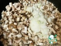 Тем временем нарезать кубиком грибы и лук. На сухую сковороду выложить грибы и дождаться когда они пустят сок. Затем добавить лук и соевый соус, продолжать выпаривать жидкость. |