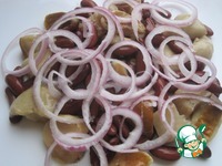 Добавляем кольца красного лука. Поливаем растительным маслом смешанным с перцем. |