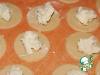 Раскатать тесто, вырезать небольшие 5 см в диаметре кружки. Поместить в центр начинку. |