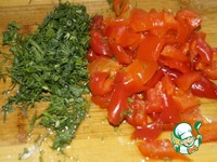 Мелко порубить укроп и порезать болгарский перец на мелкие кубики. |