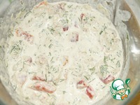 Горбушу отделить от костей и кожи, размять вилкой и добавить ее к соусу. |