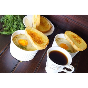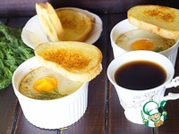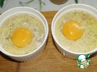 Разложить массу в формочки для запекания. Сверху разбить яйцо, желток должен остаться целым. Запекать в разогретой до 180 гр духовке коло 20 минут. |