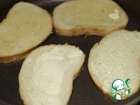 Кусочки батона или багета намазать тонким слоем сливочного масла и поджарить до румяной корочки с двух сторон. |