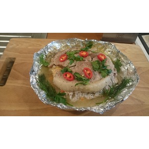 Начнем! Сначала разрезаем кусок свинины вдоль на два равных куска (как на видео). Затем хорошо натираем мясо солью и перцем. На противень укладываем фольгу в два слоя и перекладываем туда одну половину свинины. Теперь начинка. Половина - это тертый твердый сыр с чесноком, а вторая половина - мелко нарезанный помидор с сушеным базиликом и немного оливкового масла. Сверху укрываем вторым куском мяса и тщательно заворачиваем в фольгу. Теперь убираем в разогретую духовку (200 гр) и ждем 40 минут. Аккуратно открываем фольгу, делаем подобие тарелки, украшаем зеленью и подаем к столу. Приятного!!!