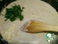 Отправляем наш соус обратно в сковороду, добавляем соль, перец, чеснок и мелко нарезанный укроп. Провариваем несколько минут, чтобы соус вобрал в себя все ароматы. |