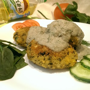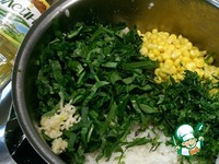 К отварному рису отправляем нарезанный мелко шпинат, укроп, петрушку, раздавленный чеснок и кукурузу. Все перемешиваем. |