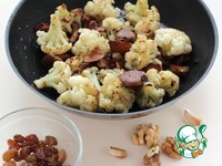 В конце обжарки добавить изюм без косточек, который заранее запарить в горячей воде и обсушить, мелконарубленный чеснок, измельченные грецкие орехи, обжарить все вместе пару минут. |