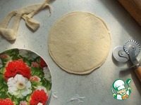 Разделим тесто на 12 частей, равных. Каждый кусочек раскатаем и с помощью блюдца вырежим круг. Подсыпаем на стол остальную муку по надобности. |