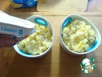 Взяла 2 формы, можно взять горшки. Разложила картофельник по формам. В одну форму налила сливки. |