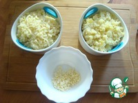 Содержимое одной формы густо посыпала натёртым сыром, а содержимое другой чуть сверху полила подсолнечным маслом. |