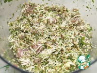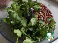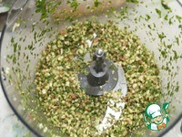 Через сутки готовим начинку. Для этого натираем на мелкой терке сыр. В чаше блендера мелко рубим арахис и зелень петрушки. |