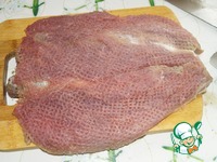 Замаринованное мясо достаем из маринада и надрезам так чтобы у нас получился ровный пласт мяса, отбиваем его немного. |