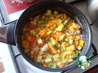 Отправляем овощи к перловке. Перемешиваем, накрываем крышкой и варим минут 15. |