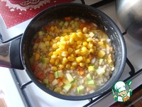 Добавляем кукурузу, можно и без неё. Выкладываем к перловке с овощами и всё делаем до полного впитывания воды. |