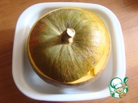 Берём форму. Можно полностью тыкву обернуть фольгой или же выложить на пекарскую бумагу. Я взяла керамическую форму, дно чуть подмазала и поставила тыквенный горшочек в неё. Выкладываем кашу. |