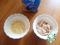 Для тех, кто любит поосновательней еду, сыр натираем на тёрке и отварную курицу (мясо) режем на кусочки или разбираем на волокна. |