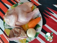 Берем половину курицы и мякоть свинины, укладываем в кастрюлю, заливаем водой и ставим на плиту. Чистим 1 морковь и 1 луковицу. |