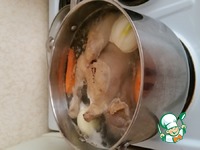 Через 30 мин после закипания кидаем луковицу и морковь и варим еще 1.5 часа на медленном огне. За пол часа до готовности кидаем лавровый лист, соль и перец горошком (все по вкусу) |