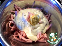 Ветчину нарезать полосочками и заправить майонезом и горчицей. Перемешать. |