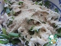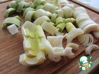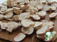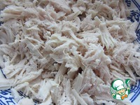 Грудку предварительно отварить и остудить. Нарезать небольшими кусочками. Половину грудки разобрать руками на волокна, а вторую половину оставим для не постной части супа. |