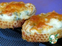 Разогреть духовку до 180 гр. Противень смазать подсолнечным маслом либо выстелить силиконовым ковриком. На багет выложить получившийся фарш. |