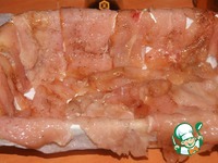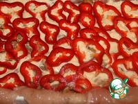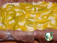 Нанести на филе 1/3 часть заливки, сверху выстелить желто-зеленый перец нарезанный тонкими лентами. |