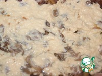 Сверху ровным слоем поместить грибы и нанести 1/2 часть оставшейся заливки. |