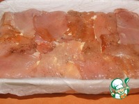 Филе нарезать на тонкие пластины и слегка отбить. Посолить и поперчить каждое. добавить соевый соус и оставить мариноваться минимум 1,5 часа. |