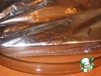 Закрыть всю поверхность свисающими концами филе. Плотно закрыть верх фольгой. |