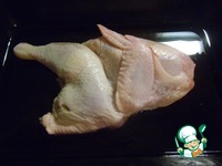 Курицу моем, натираем солью и выкладываем на смазанный растительным маслом противень. |