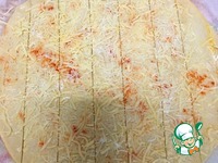 Скалку присыпать мукой и немного умять сыр в тесто лёгким раскатыванием. |