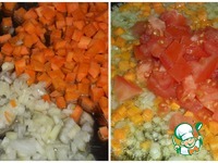 В сковороду наливаем растительное масло. Выкладываем лук, морковь, помидор. Обжариваем 5 минут. |