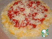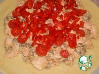 Сверху поместить нарезанные кружочками черри и мелкими кусочками перец. |