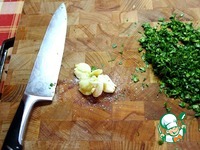 Зелень порубил, петрушку и сельдерей только листики, а кинзу вместе со стебельками. Чеснок раздавил, посыпал солью, порубил, потом смешал с травой и ещё раз порубил. Пусть полежит пару минут это всё. |