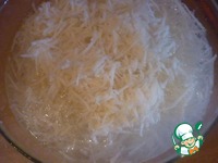 Натереть на тёрке для корейской моркови. Залить холодной водой на 3-5 минуты (для удаления лишней горечи), отжать. |