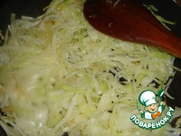 Все продукты беру на глаз. На растительном масле спассеровать мелко порезанный лук и добавить нашинкованную тонкой соломкой капусту. |