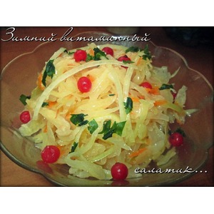 Описание: Конечно же, этот салат можно готовить не только зимой - квашеная капуста и другие его ингредиенты полезны в любое время года, а если учесть, что он не только полезный, но и вкусный, то готовить его можно хоть каждый день! К тому же такой салат можно подать и к картошке, и к мясным блюдам - котлетам, тефтелям и т. д.