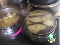 2. Отварить баклажаны и картофель в кипящей подсоленной воде, баклажаны не до готовности, минут 5, а картофель до мягкости чтобы сделать пюре. |