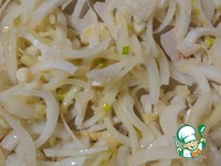 Далее мамуля добавляет соевый соус ТМ "Kikkoman", перемешивает и перекладывает заготовку в отдельную миску. Иногда заготовку она делает с вечера и держит в холодильнике. |