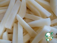 Картофель мамочка моет, чистит, режет соломкой. Растительное масло мамуля разогревает на сковородке, выкладывает в него картошку и жарит ее практически до готовности. |