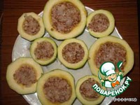 Кабачки очистить и нарезать кружочками толщиной 1,5-2см. Вытащить ложкой середину, но не до конца (должна получиться чашечка с дном) |