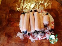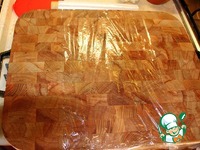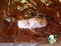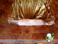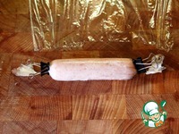 Придерживая кончики плёнки прокатываем сосиску по доске и закручиваем её по туже. По достижении приемлемого результата прижимаем пальцами одной руки за хвостики к доске, что-бы не развернулись. |