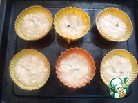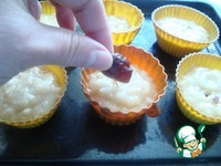 Формы силиконовые обливаем водой и раскладываем тесто по 1/2 высоты формы. Тесто очень поднимается. В серединку каждой формы кладёт 1/4 часть финика. |
