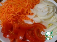 Затем добавляем лук, минуту спустя морковь, все перемешиваем аккуратно, продолжаем жарить пару минут.