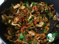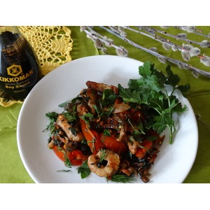 Добавляем баклажан и помидор, красный жгучий перец, паприку, 1.5 ст. л. соуса Kikkoman, уксус и сахар. Если необходимо, то и соль. Перемешиваем, накрываем крышкой на минуту, чтобы все пропиталось специями и соусом. |