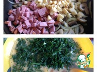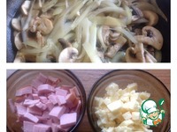 Лук нарезать полу кольцами, шампиньоны пластинками. Поставить обжариваться в небольшом количестве растительного масла. Тесто достать и разморозить. Ветчину и сыр нарезать средним кубиком. |