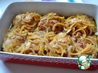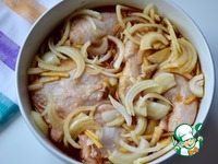 Залить куриные бедрышки маринадом и поставить запекаться в разогретую предварительно до 200°C духовку минут на 25-30. Если лук в процессе начнет подгорать, прикрыть блюдо фольгой. |