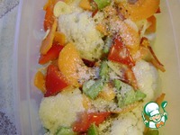 Уложить капусту в контейнер, сверху выложить овощи. Посыпать кориандром и сахаром. |