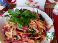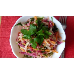Описание: В составе редьки много минералов и витаминов. Она обладает бактерицидным и противомикробными свойствами. Поэтому салат из редьки очень полезен зимой и в начале весны. Так же редька очень богата клетчаткой, и салат из нее будет настоящей "метелочкой", которая выметет из нашего организма все ненужные шлаки.